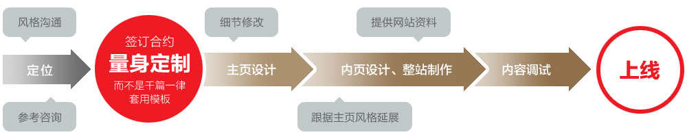 一個網站往往需要通過5步, 第一步是需求調研,我們需要跟貴司的領導人或相關負責人進行需求調研溝通,掌握真實的需求;第二步是網站的功能和內容架構設計;第三步是網站的原型框架設計;第四步與第三步同時進行的是網頁的品牌化視覺風格設計;第五步是內頁設計,之后是頁面制作和后臺對接,完成測試之后我們就移交到客戶的服務器上或者托管到我們的合作伙伴阿里云服務器上。這些過程我們富有經驗的項目經理會引導您完成。